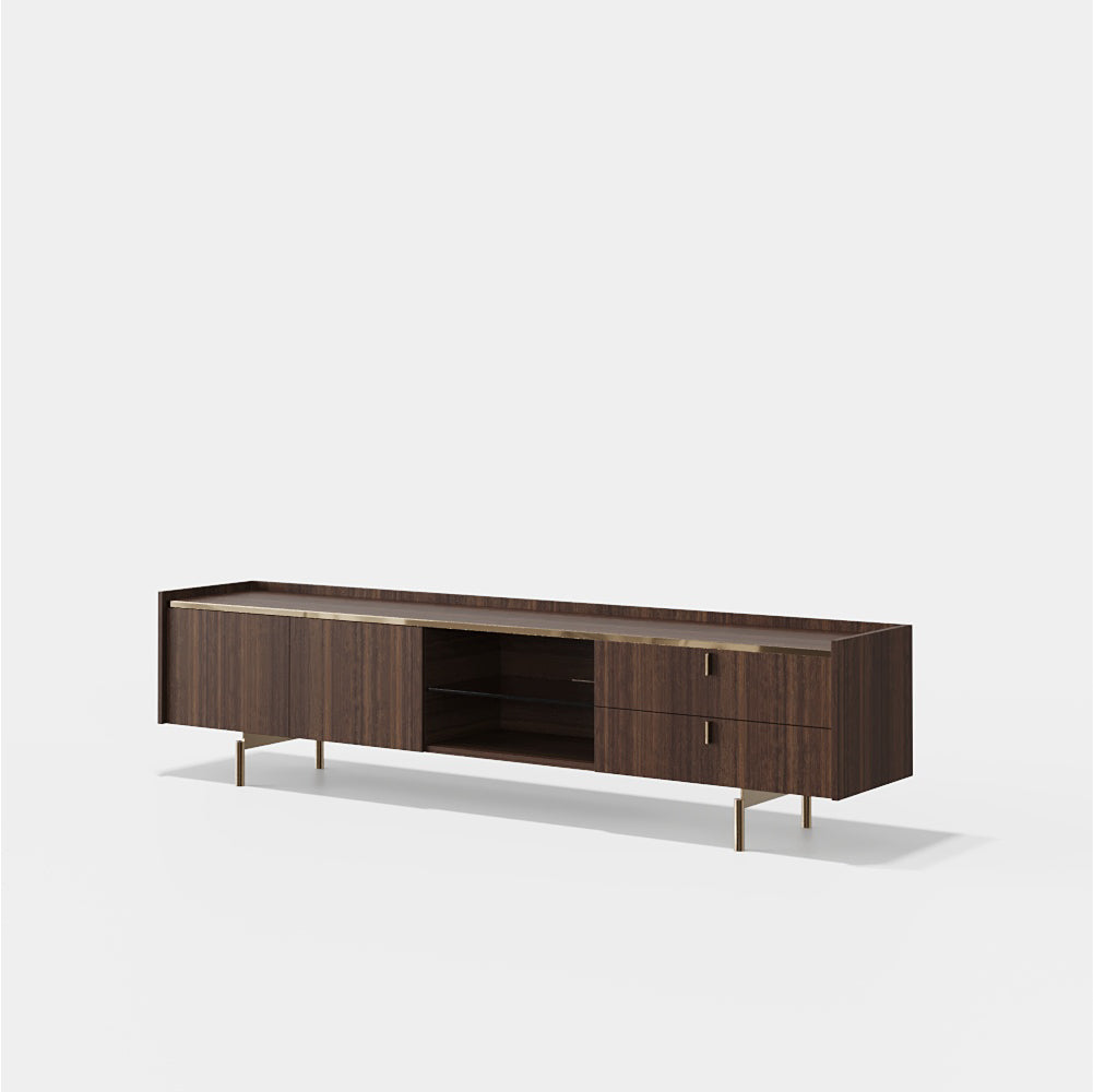 The Senza TV Base offers elegance and functionality with a matte or glossy lacquer finish and epoxy details. Customize with woods such as Walnut, Oak, Eucalyptus, or Ash, and choose between polished stainless steel, bronze, or gold. Ideal for complementing modern and sophisticated living rooms.