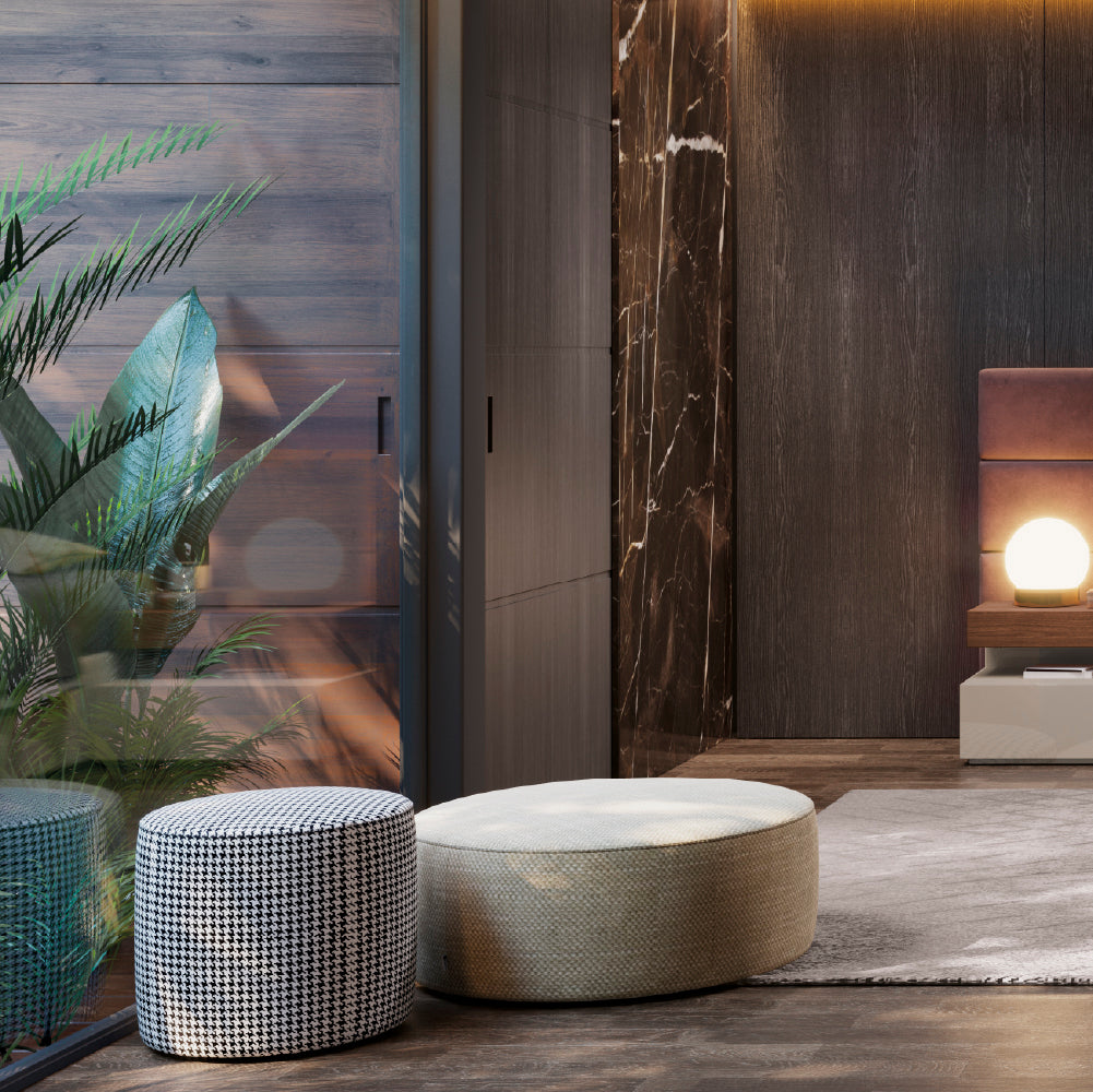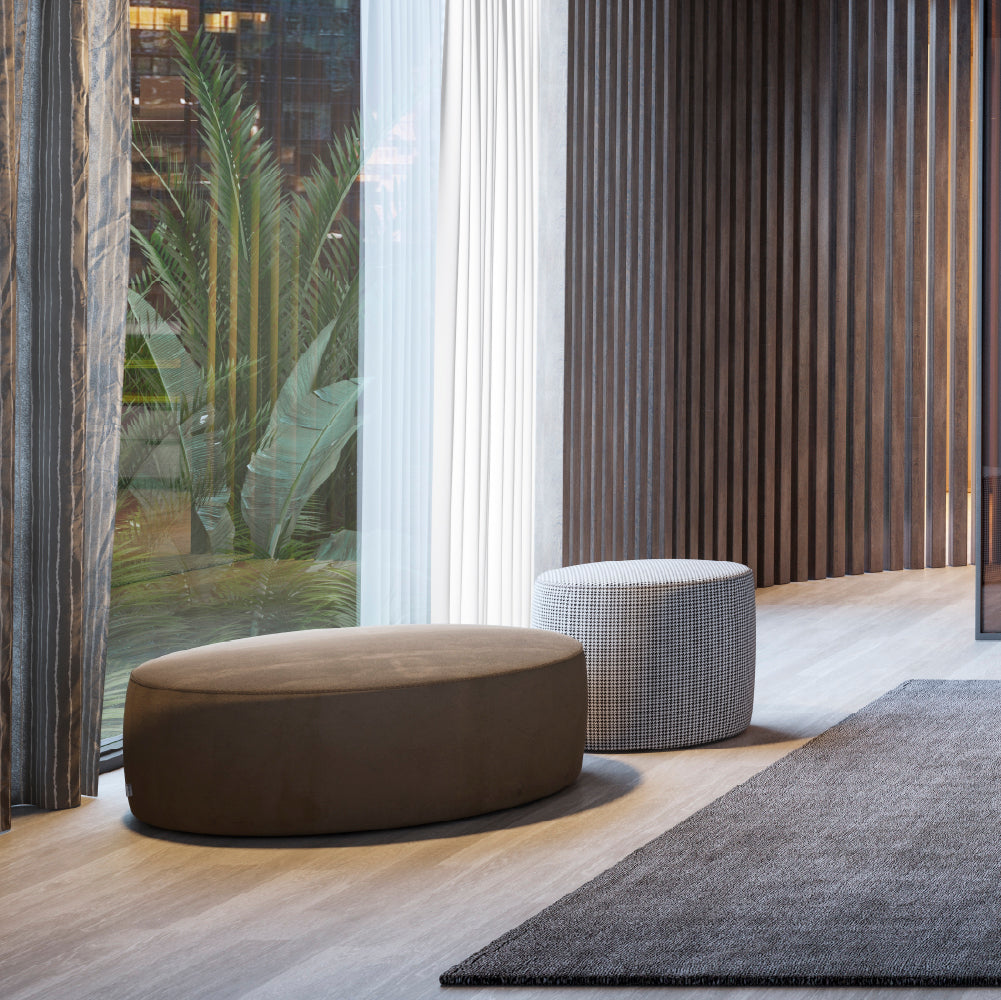 The Ellender Puff is customizable with different fabrics of your choice. Ideal for creating modern and sophisticated environments, combining comfort and exclusive design.
